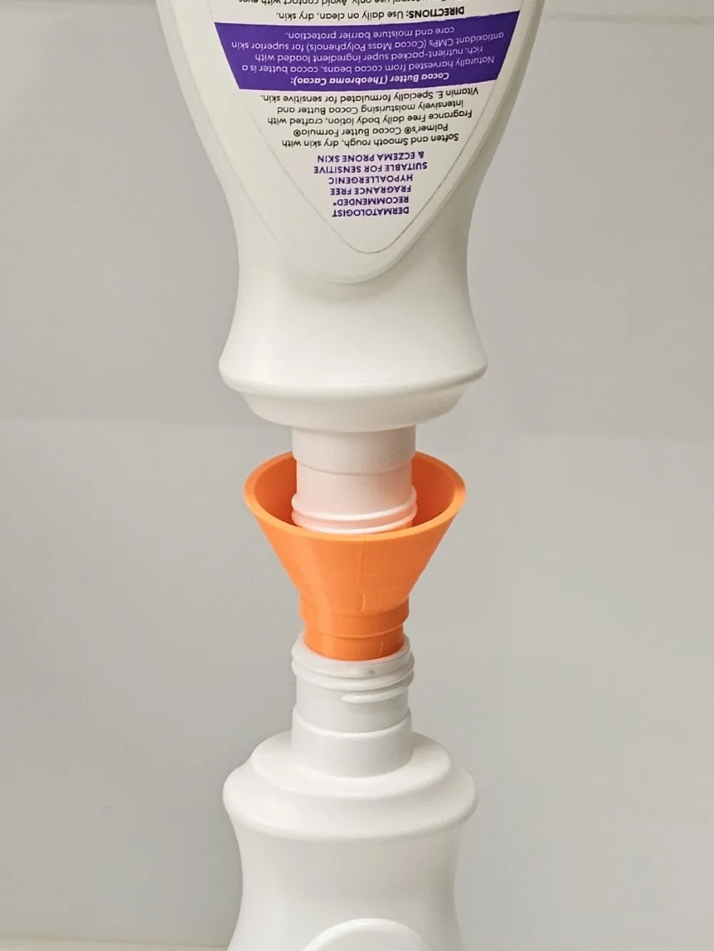 The stepped neck grips standard bottle openings from the inside while the wide cone catches any drips mid-transfer. Works with lotion, shampoo, conditioner, dish soap, laundry detergent, and most liquid products. Printed in one piece β no assembly, no separate parts to lose.