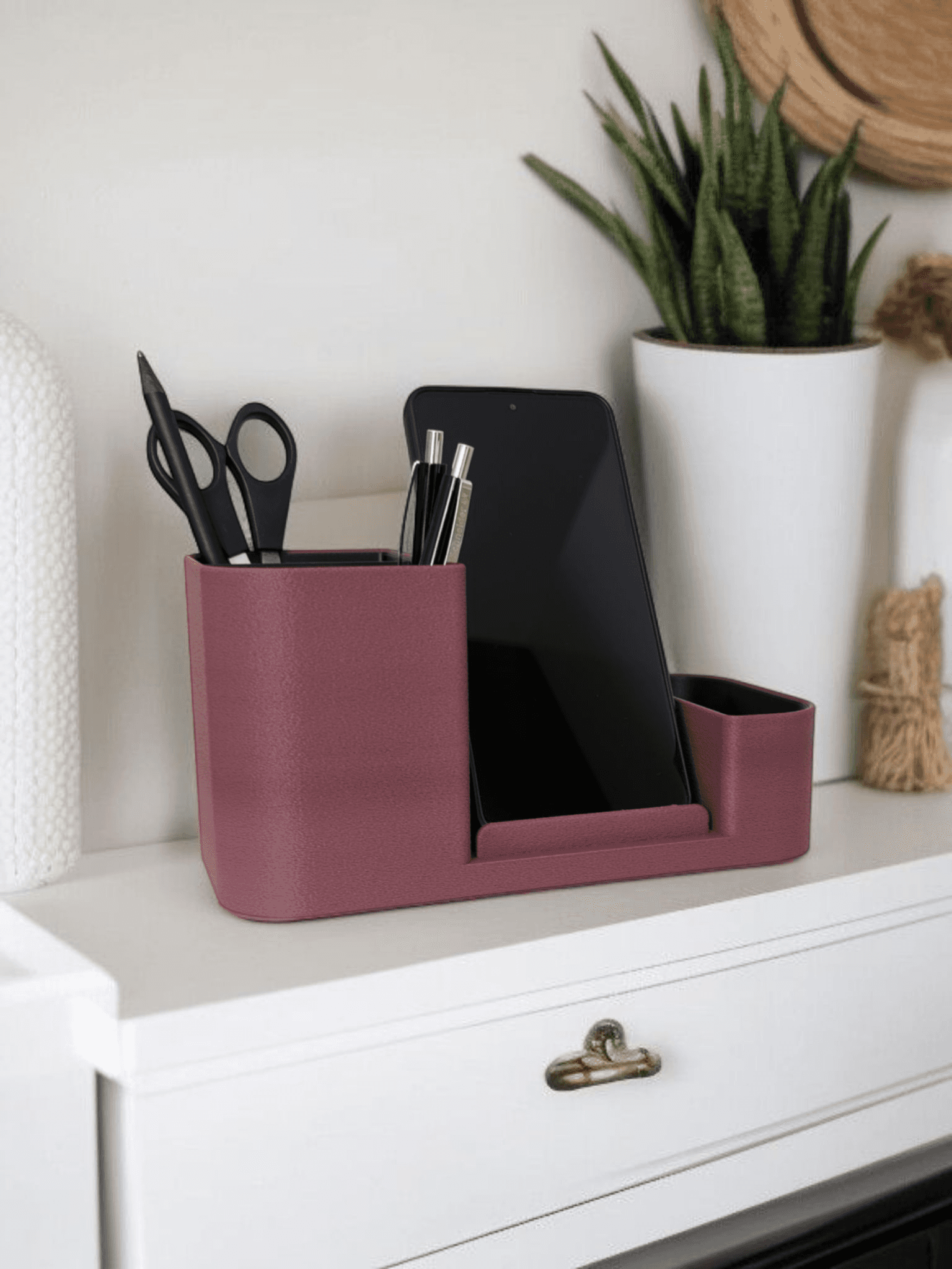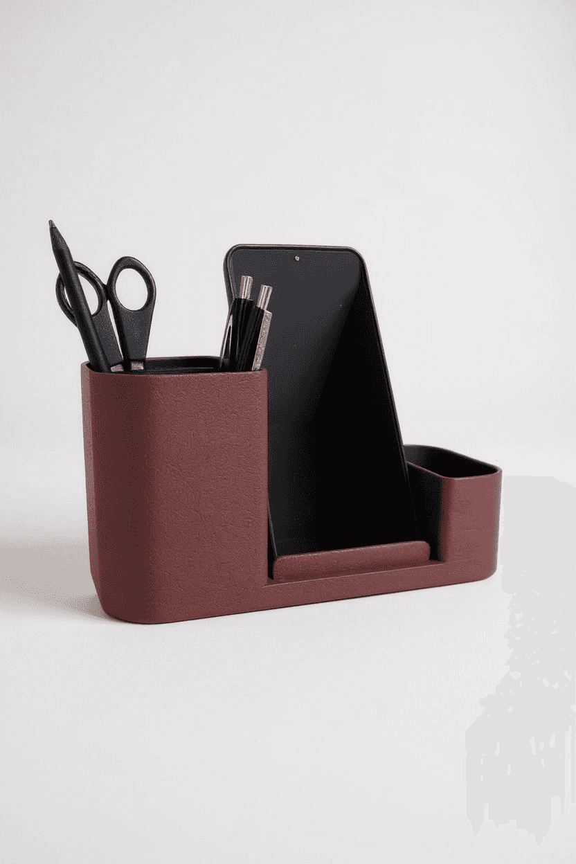 Everything your desk needs, in one clean footprint. The Desk Organizer with Phone Stand combines a deep pen and scissors cup, a built-in phone slot that holds your screen at the perfect viewing angle, and a smaller side compartment for whatever else tends to pile up β paper clips, erasers, a charging cable folded in half.