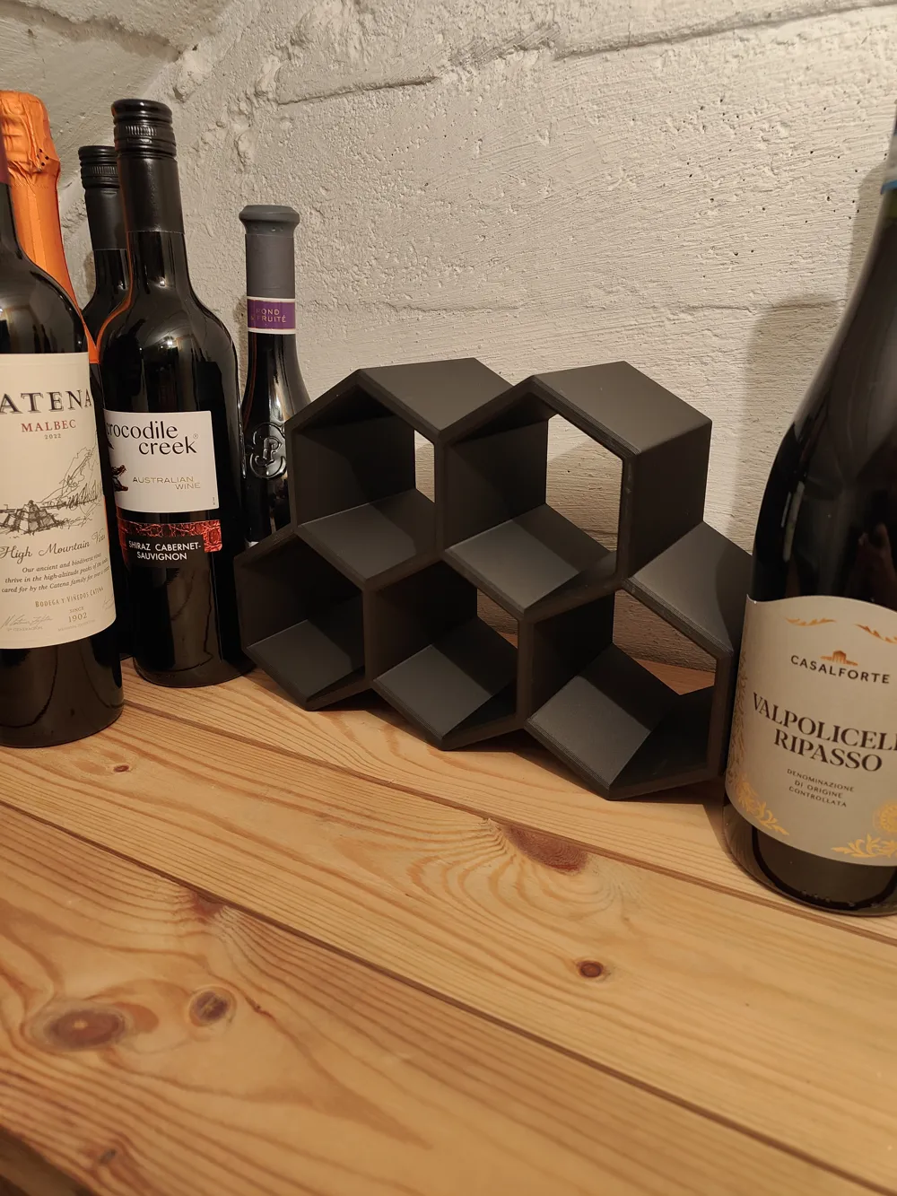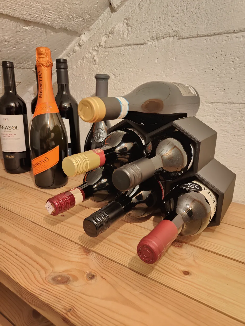 Each hexagonal cell cradles a standard 750ml bottle. The geometric silhouette is bold enough to stand alone and minimal enough to fit any kitchen aesthetic.
